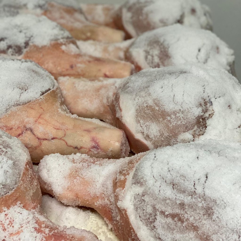 The leg is then refrigerated at a temperature ranging from 34°F to 39°F, with a humidity level of approximately 80% for about a week and gets a second thin coating of salt which is left on another 15 to 18 days, depending on the weight of the leg. Salt is the only preservative used in the processing method; no chemical elements are allowed.