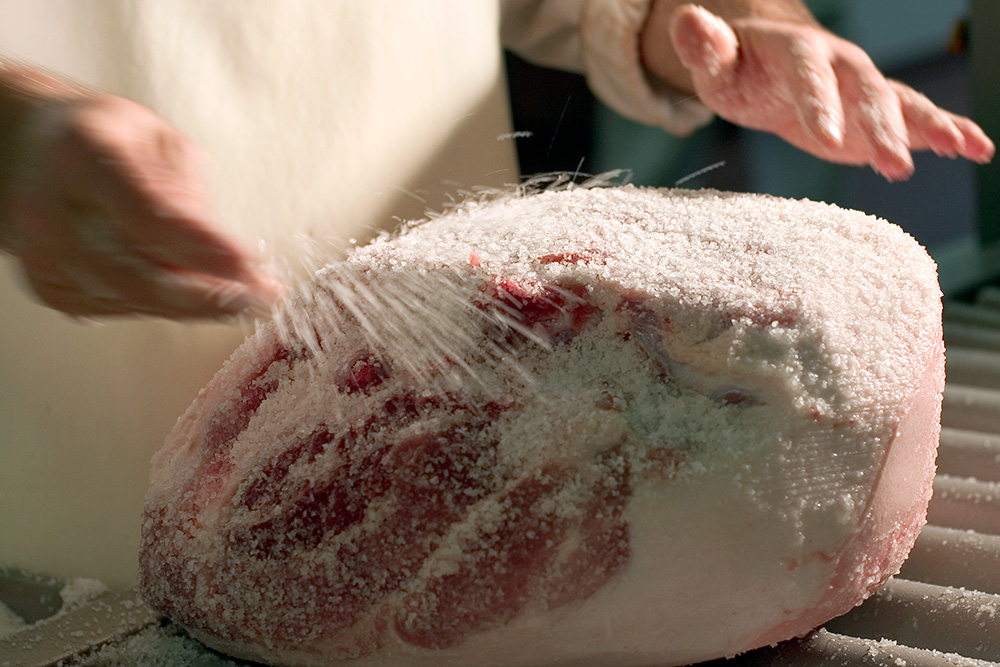 The exposed surfaces of the hams are then softened with a mixture of lard, salt and pepper to prevent the external layers from drying too quickly.
